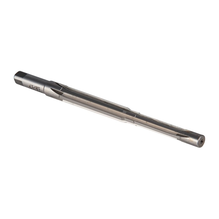 SPECS: M7 High speed steel, in-the-white. Solid pilot, six, straight flutes, right-hand cut. Rimfire reamers have 1/4" (6.3mm) diameter round shank. Centerfire reamers have 3/8" (9.5mm) square drive shank. .50 BMG has a 1/2" round shank.