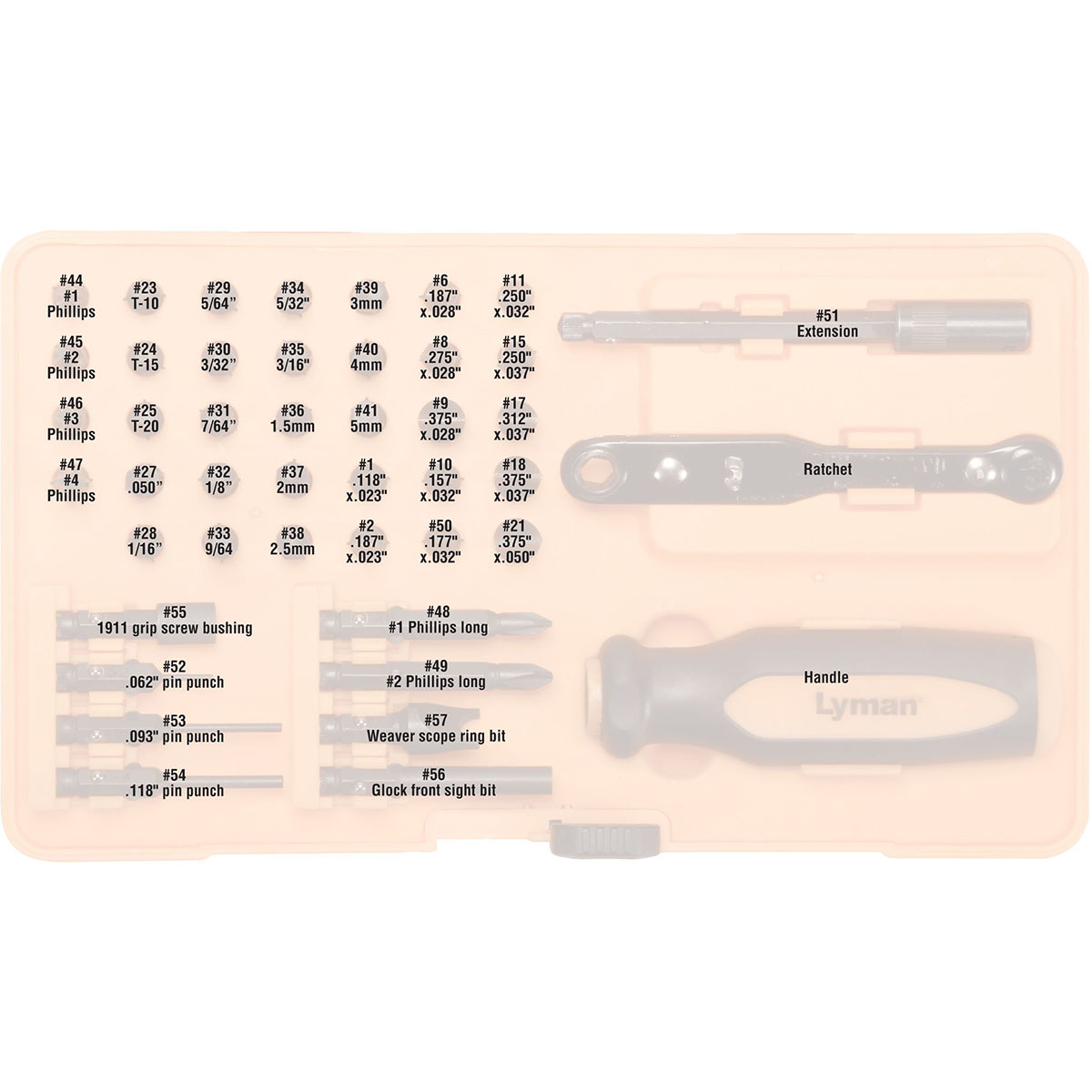 The Lyman Master Gunsmith Tool Kit is a comprehensive collection designed to equip firearm enthusiasts and hobbyist gunsmiths with the essential tools required for firearm maintenance, enhancement, and repair. This kit ensures that customers have access to purpose-built tools that facilitate efficient work on firearms without causing damage to small, critical components.