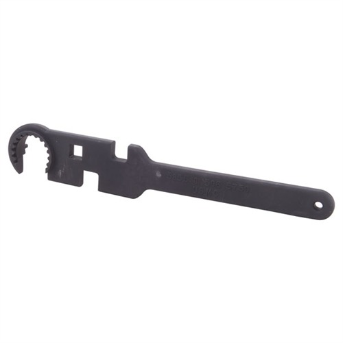 Extra-heavy duty armorers wrench provides easier installation and removal of all barrels up to 1¼" diameter with either encapsulated or peg-style barrel nuts. Extra-long handle features smooth, contoured edges for comfortable use. Includes ½" square drive opening for torque wrench application; 5⁄8" and ¾" slots fit receiver extensions and A1/A2 flash suppressors .223 for AR-15/M16 application. 3/4 inch slot may not fit some brakes, flash hiders or comps with less than .410 long driving flats.
